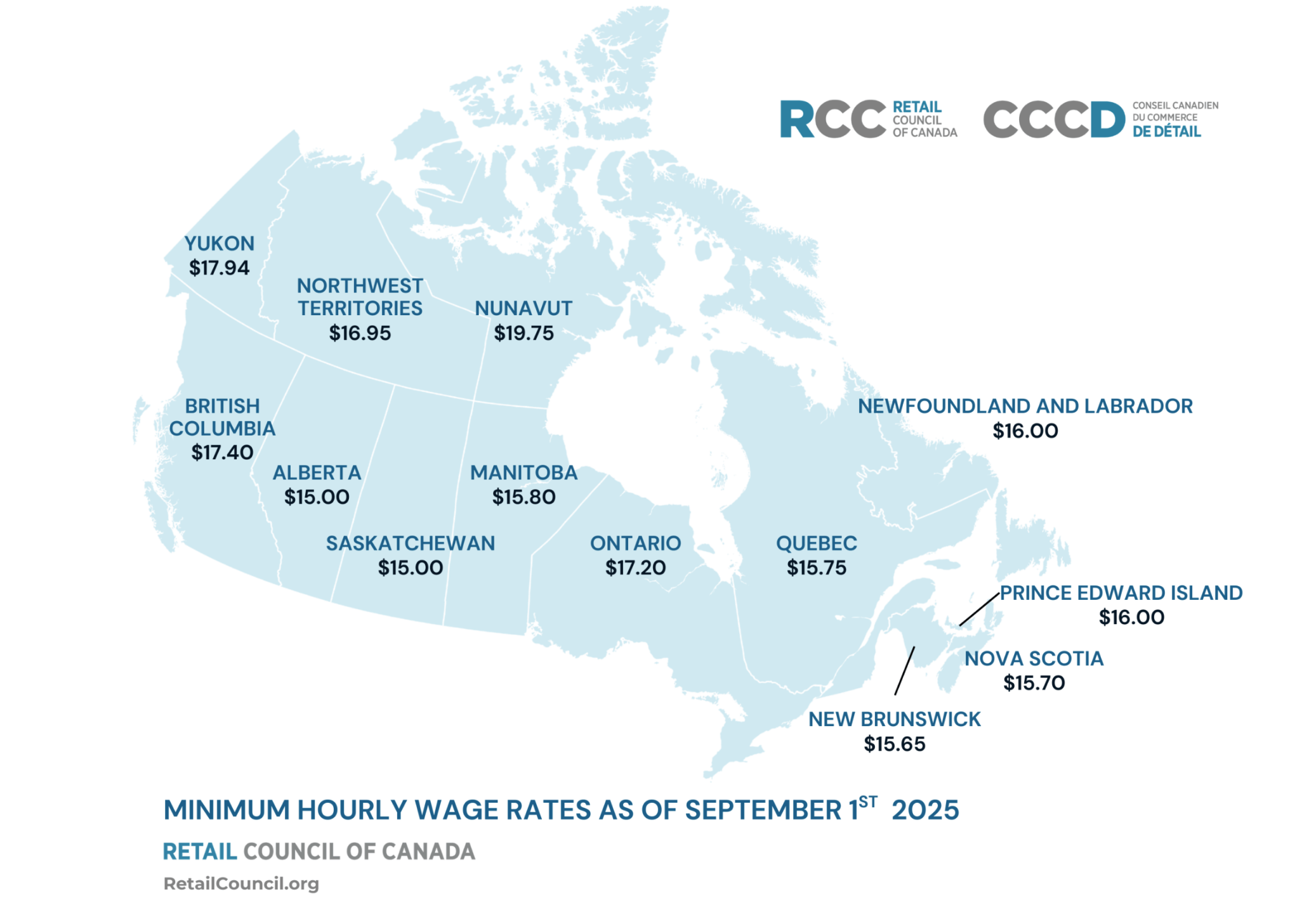 O salário mínimo por hora no Canadá varia de estado para estado, de 15 a 18 dólares canadenses.